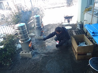 かまどにくべる薪を頭に雪をのせながら一輪車で運んだり、吹き込む雪の中火の番や、